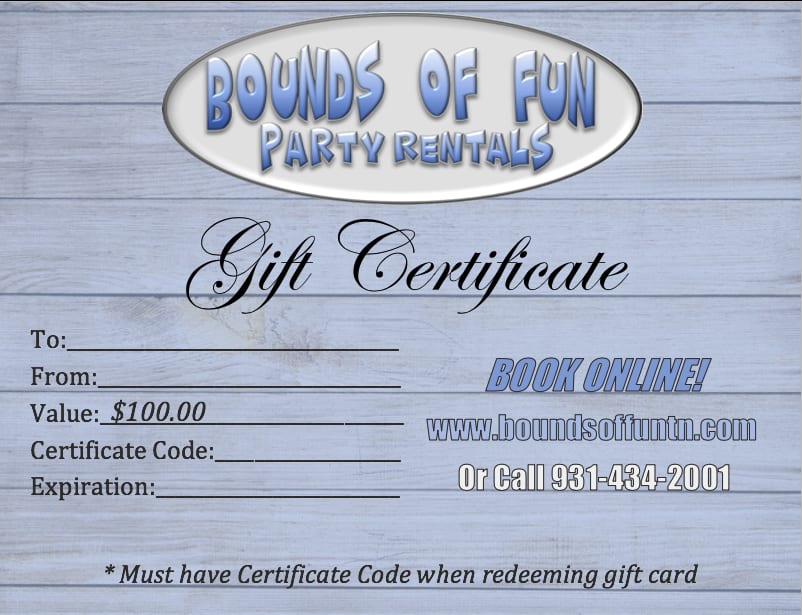 Shopping for a loved one can be difficult, but we have the answer! Get them the gift of FUN! Gift certificates with Bounds of Fun can be used for any of our products including ALL inflatables! Whether it's for a child that wants to pick out their favorite bounce house or an ADULT that loves our HUGE waterslides, our Gift Certificates are the perfect gift for anyone who loves having FUN!