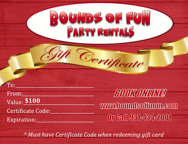 Shopping for a loved one can be difficult, but we have the answer! Get them the gift of FUN! Gift certificates with Bounds of Fun can be used for any of our products including ALL inflatables! Whether it's for a child that wants to pick out their favorite bounce house or an ADULT that loves our HUGE waterslides, our Gift Certificates are the perfect gift for anyone who loves having FUN!