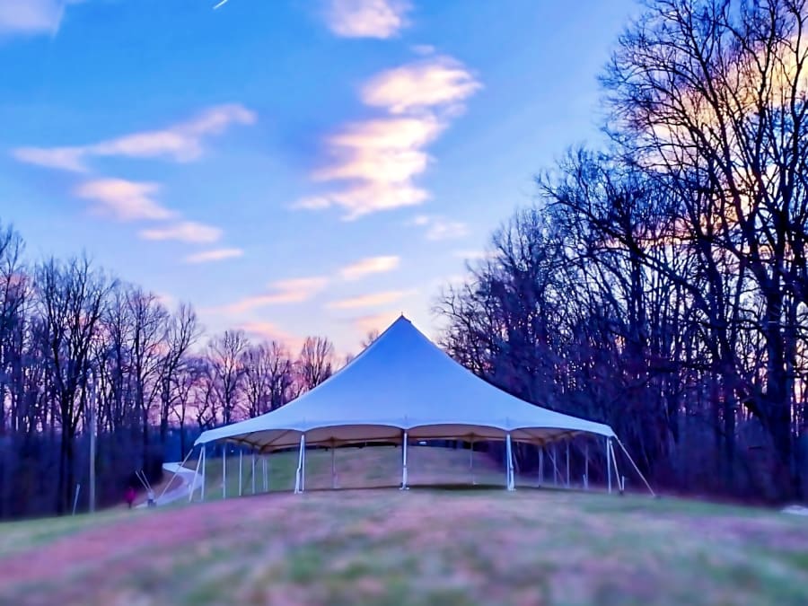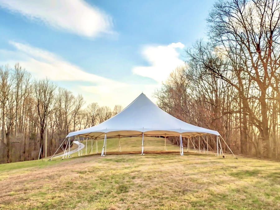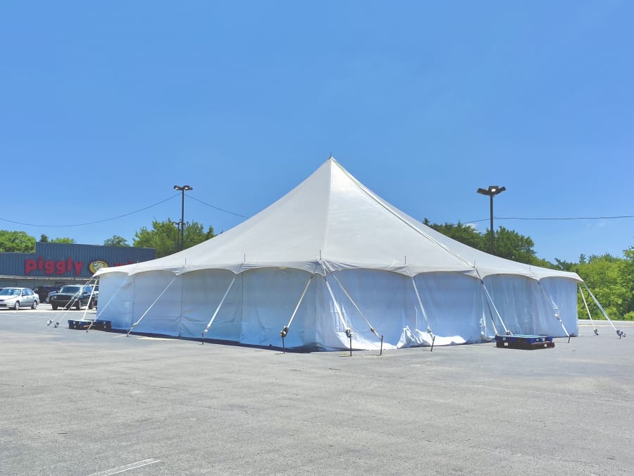 This tent covers 1,600 square feet. It requires an unobstructed grass area of 50'x50' for installation. It has one center pole.