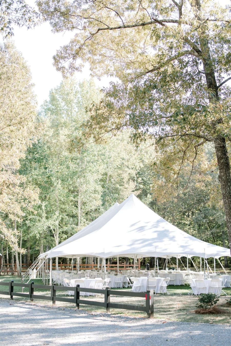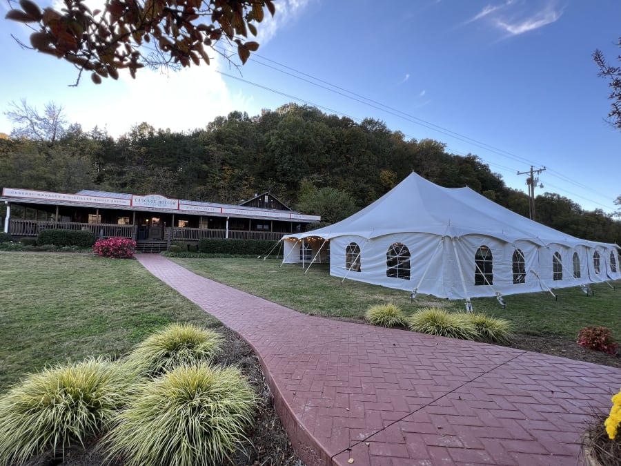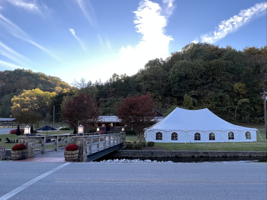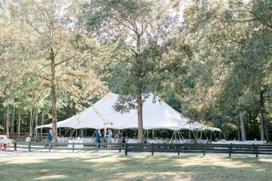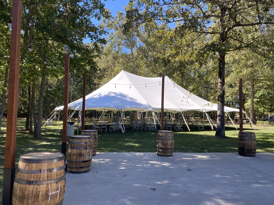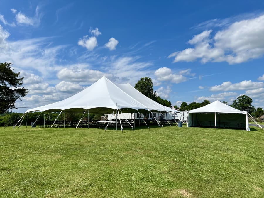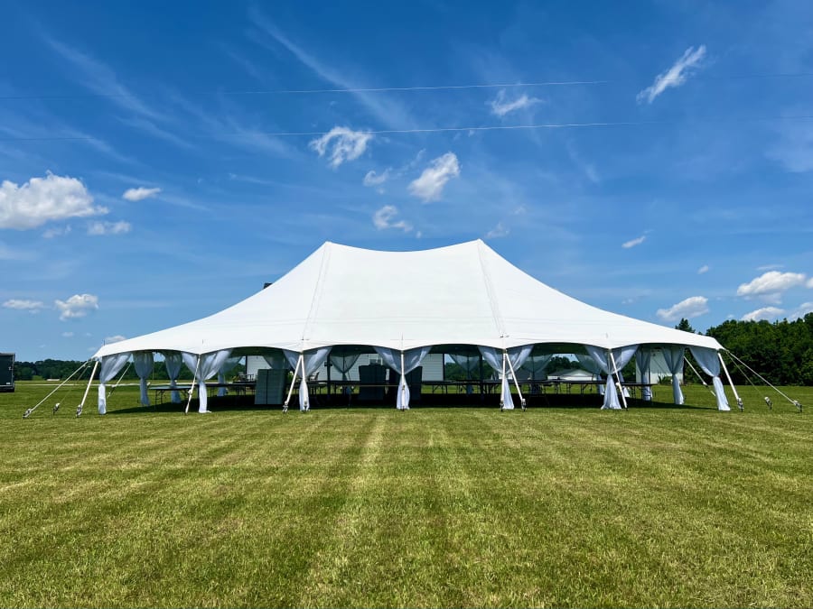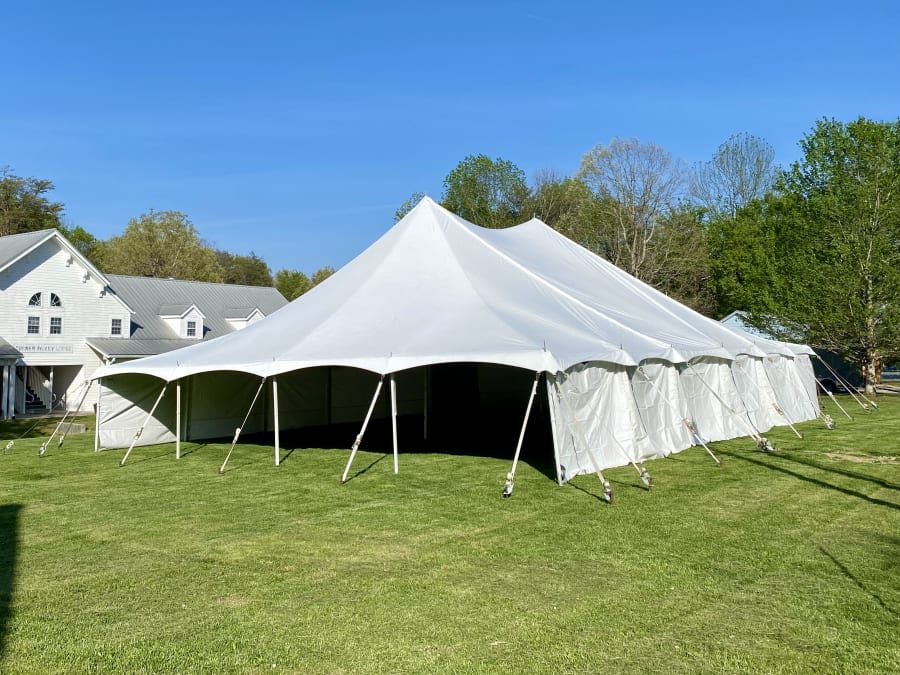 This tent covers 2,400 square feet. It requires an unobstructed grass area of 50'x70' for installation. It has two center poles. Our 40'x60' is in now and available to reserve!