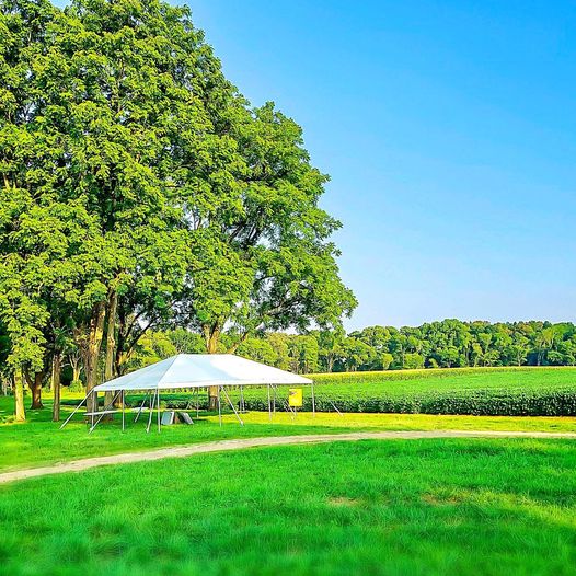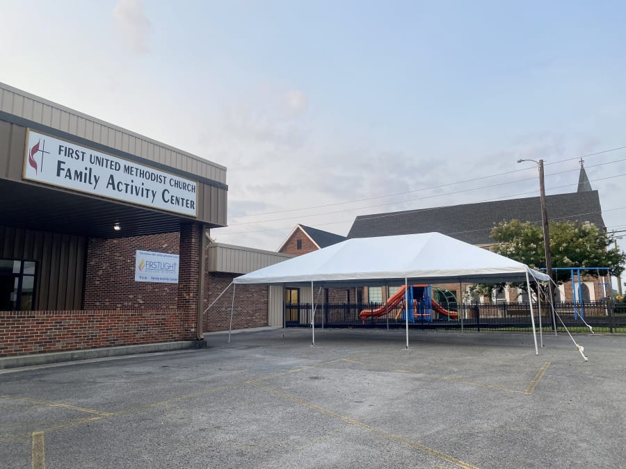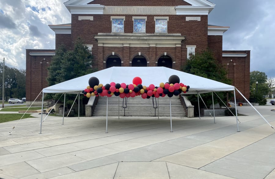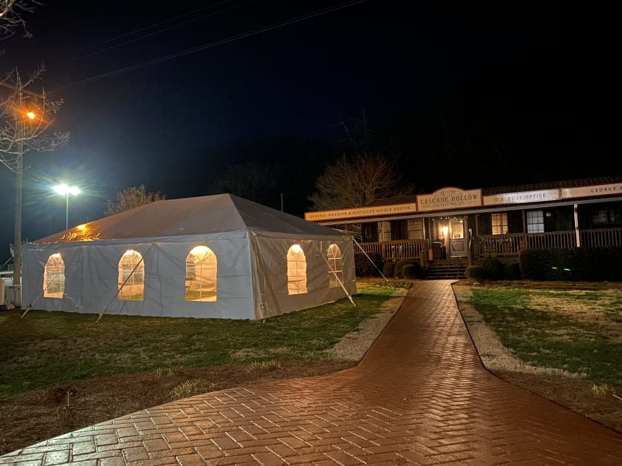 NO Center Pole! This tent covers 600 square feet. It requires an unobstructed grass area of 30'40' for installation. It can be set up on asphalt which will require us to drill holes into the asphalt. We are able to fill the holes after the event for $5 per hole if requested.